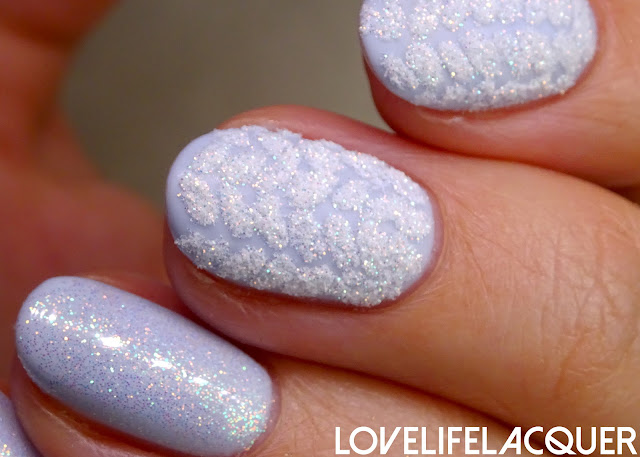Hi guys! I have been meaning to do sweater nail art for so long. And I also wanted to try out the sugaring technique. There! Two birds, one stone. Today I want to show you my first attempt at knitted nails and sugaring. I am quite pleased with how it turned out: soft colours, sparkly, looks like a sweater. Yep, it checks all the boxes for me :-D. No, I will be looking into it a bit more and try it again later. To get if more refined, you know ;-). Now, let's move onto the rest of the pictures, shall we? <3